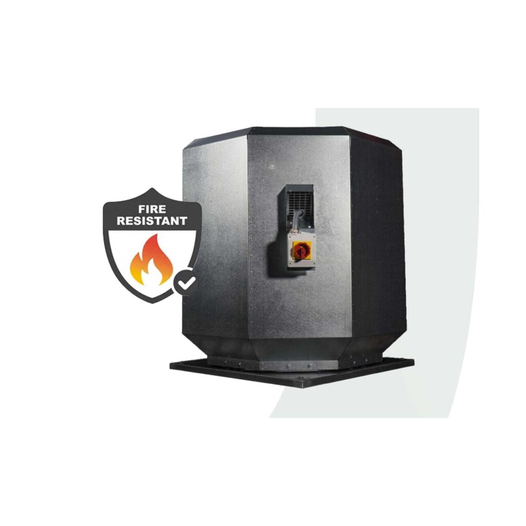 The vertical discharge roof fan line ROOF-HM is designed for facilities that require the evacuation of fire smoke in environments such as industries, underground car parks, shopping malls, hospitals, schools, theaters, and museums. ROOF-HM fans are suitable for conveying clean air and non-dusty smoke at a maximum continuous service temperature of 120°C, with peaks of up to 180°C, and can handle fire emergencies at temperatures of 400°C for 2 hours (F400). They can achieve very high performance, with capacities of up to 55,000 m³/h and 2000 Pa.
